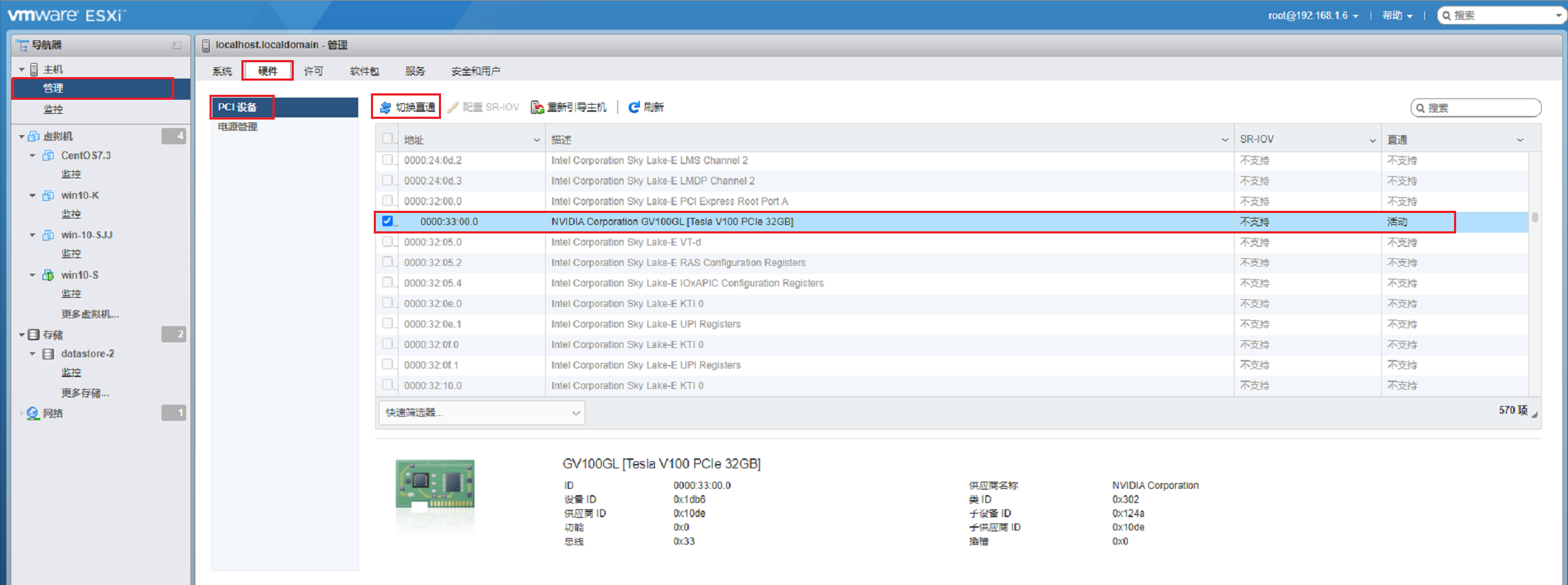 环境:ESXi 6.7U3;NVIDIA Tesla V100 PCIe 32G。