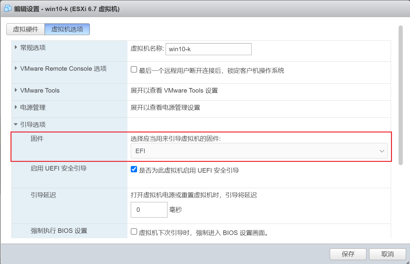 1)先确认虚拟机是否EFI引导:编辑虚拟机 - 虚拟机选项 - 引导选项 - 固件 - EFI;