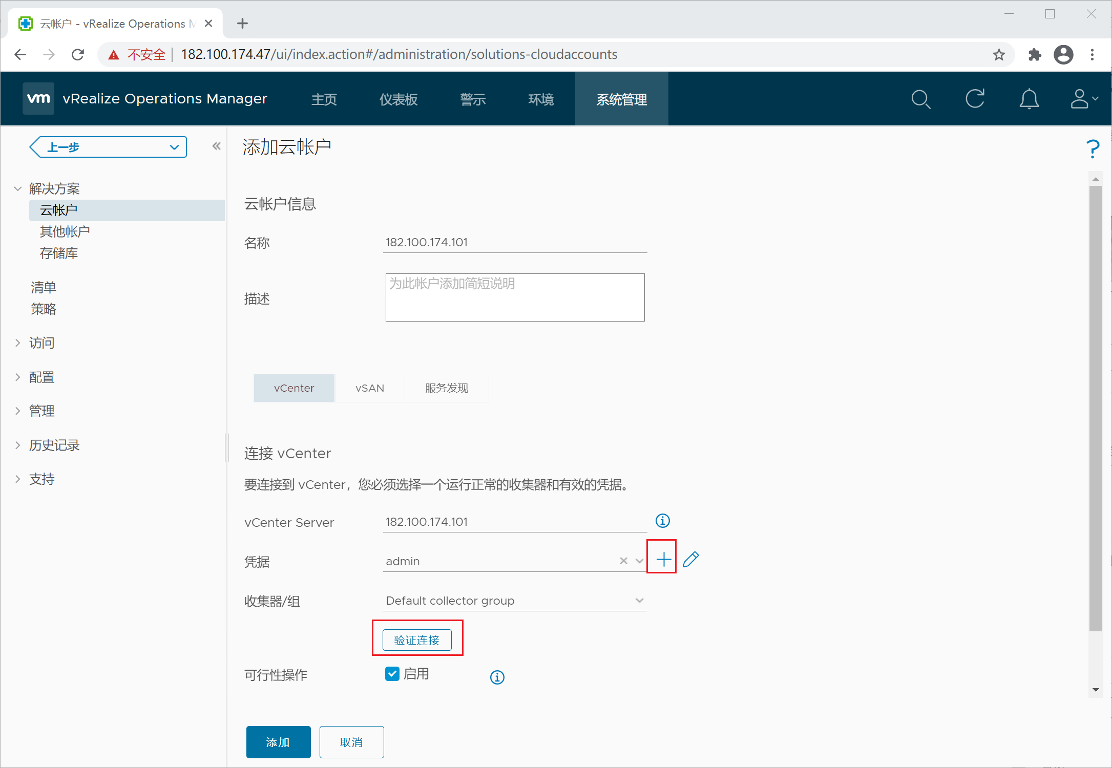 18、按照提示添加vCenter相关IP,账户和密码,验证连接。