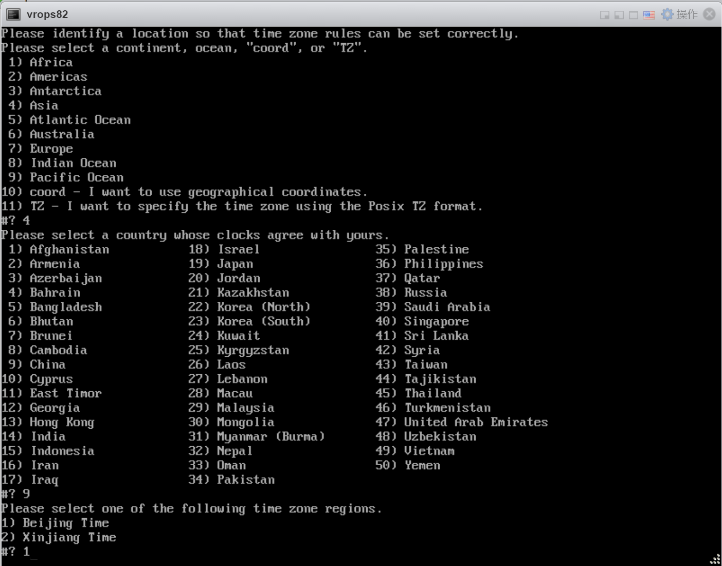 9、设置时区,按照数字提示选亚洲,中国,北京时间,保存。