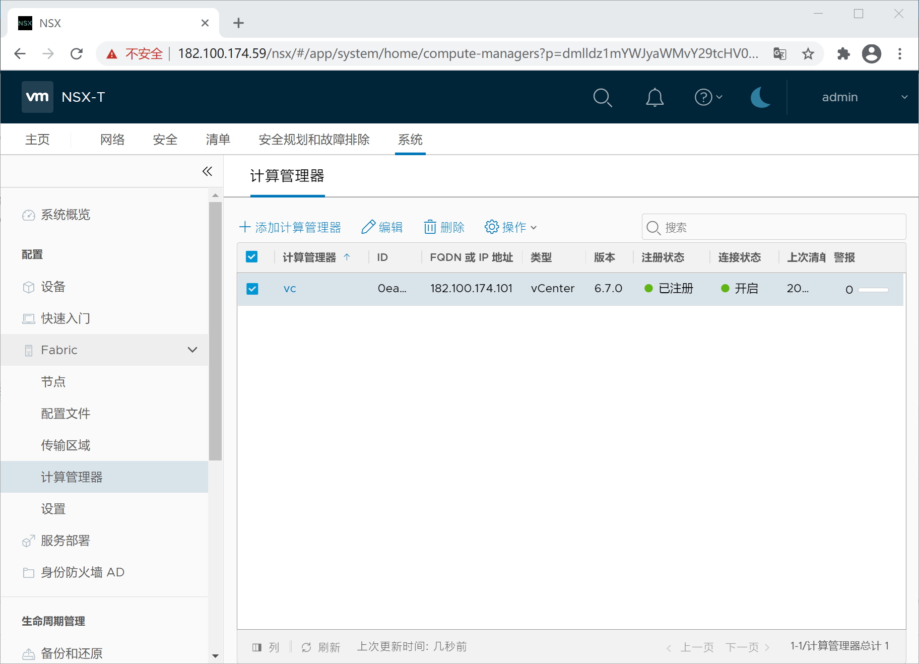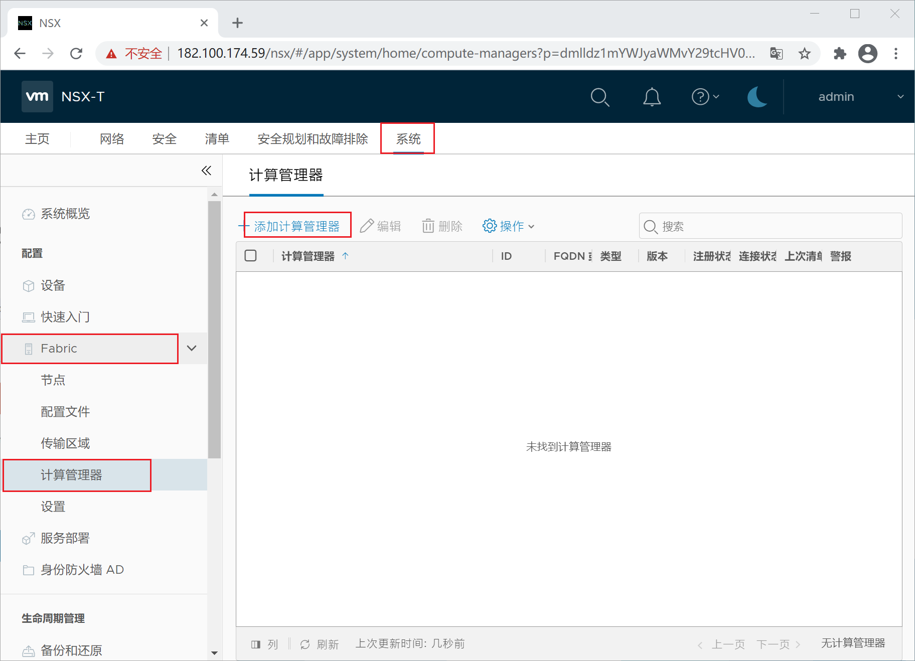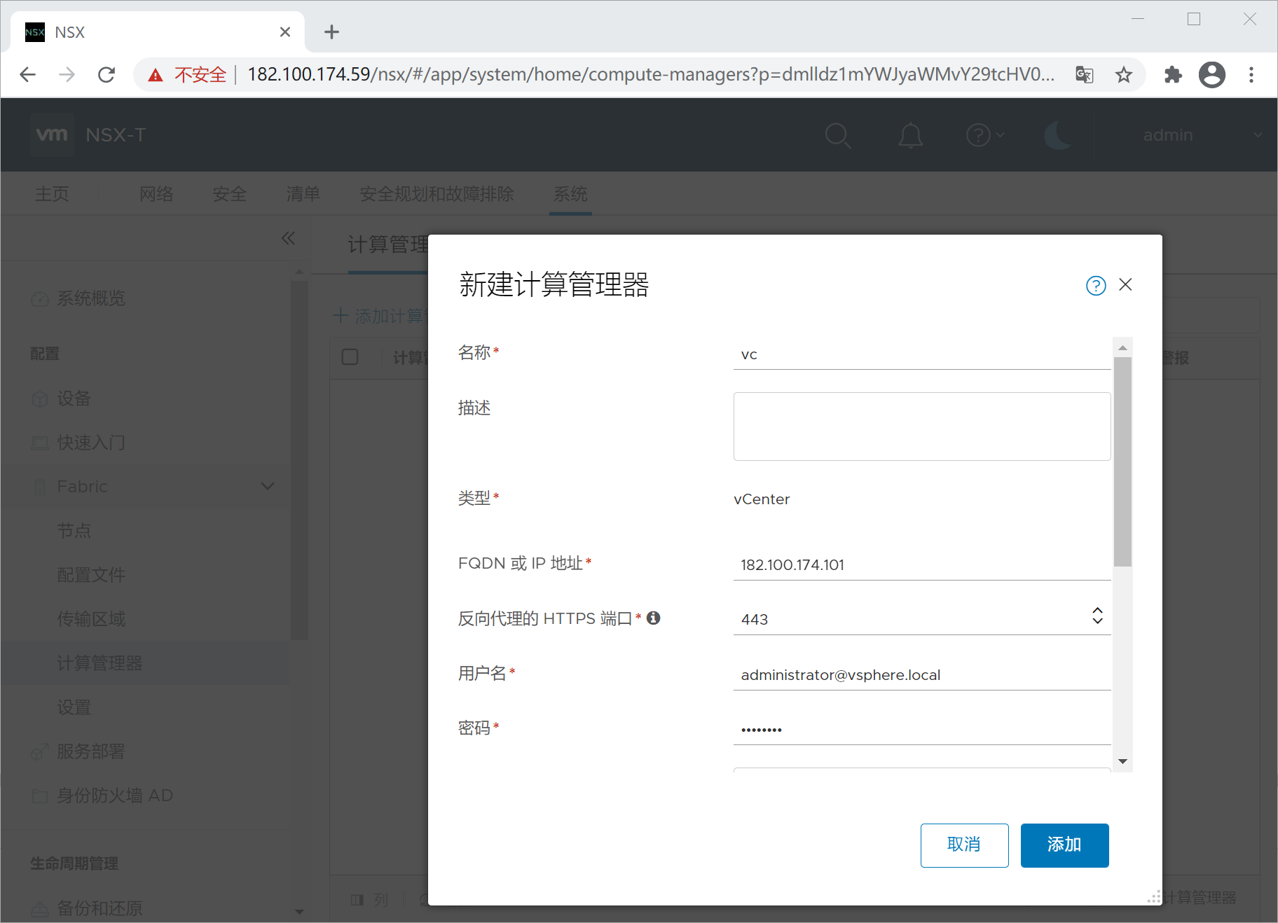 8、注册vCenter,选择系统-配置-Fabric-计算管理器,添加