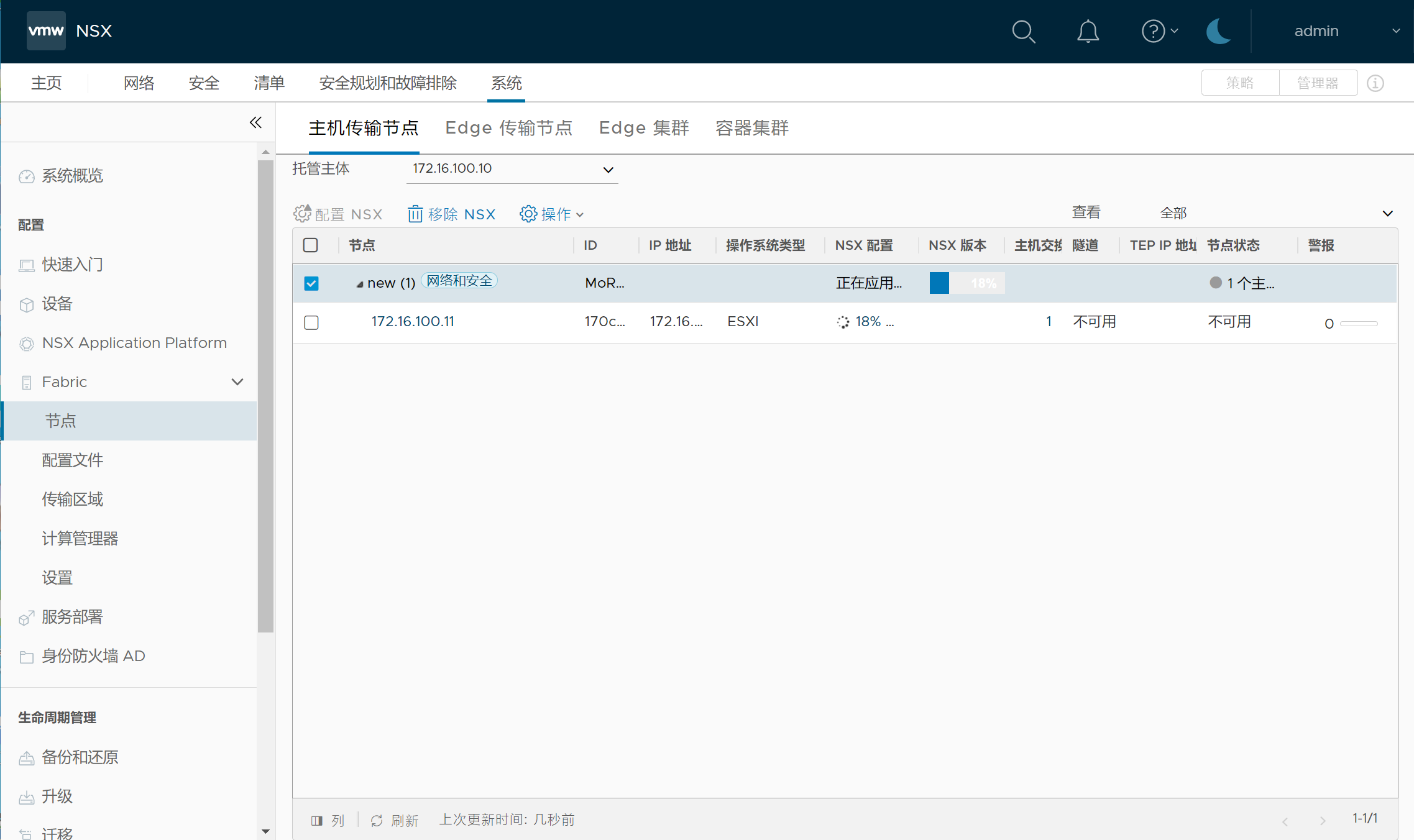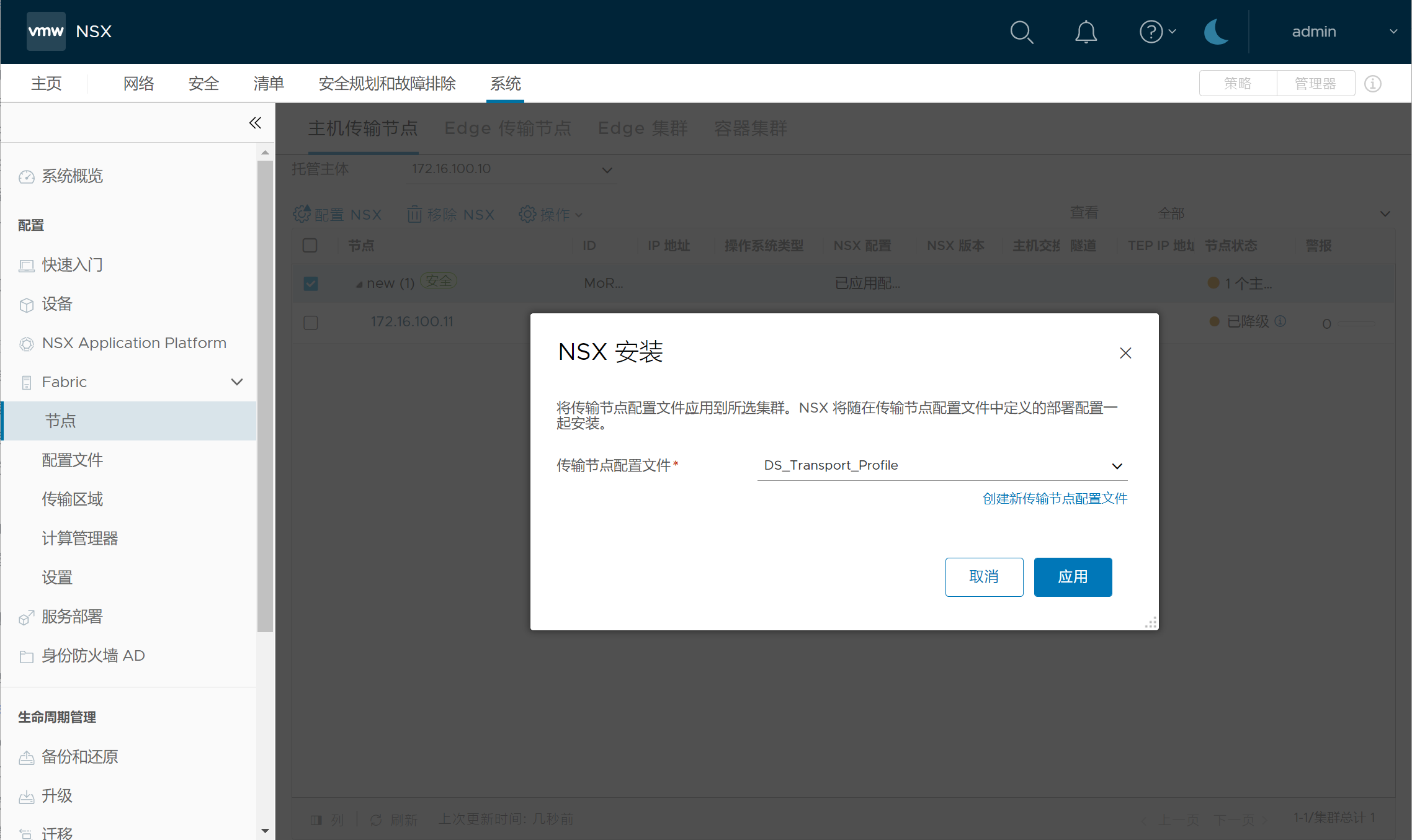 系统,节点,选择托管主体vCenter,集群,配置NSX,选择刚创建的传输节点配置文件DS_Transport_Profile,应用;