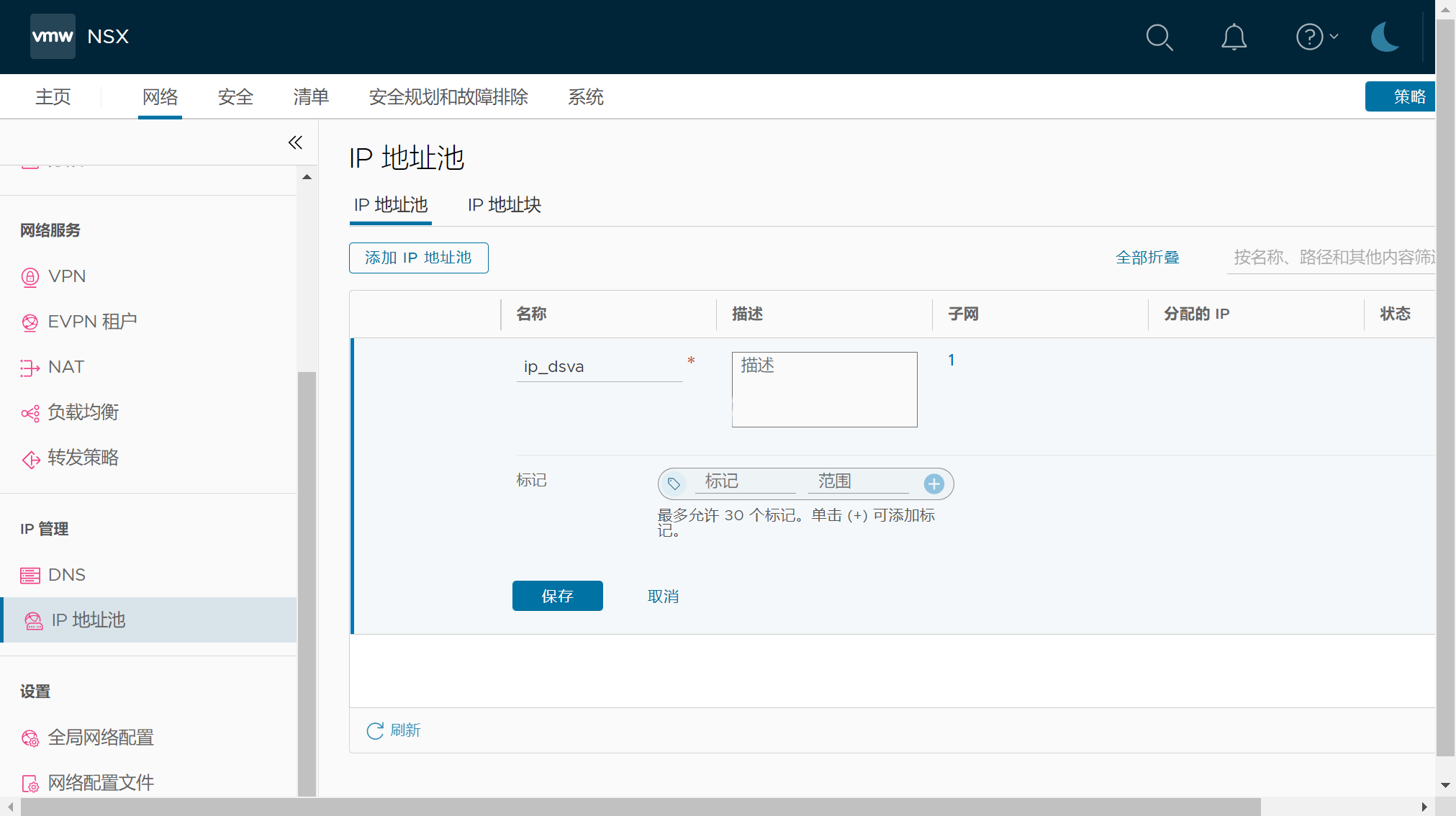 按照提示填写名称,选择集群,网络勾选自己定义的网络(根据实际情况选择IP池)保存。