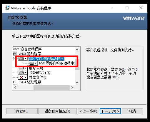 1、注意需要无代理保护的虚拟机在安装VMTools时候需要选择全部安装或者自定义安装时勾选如下NSX组件;