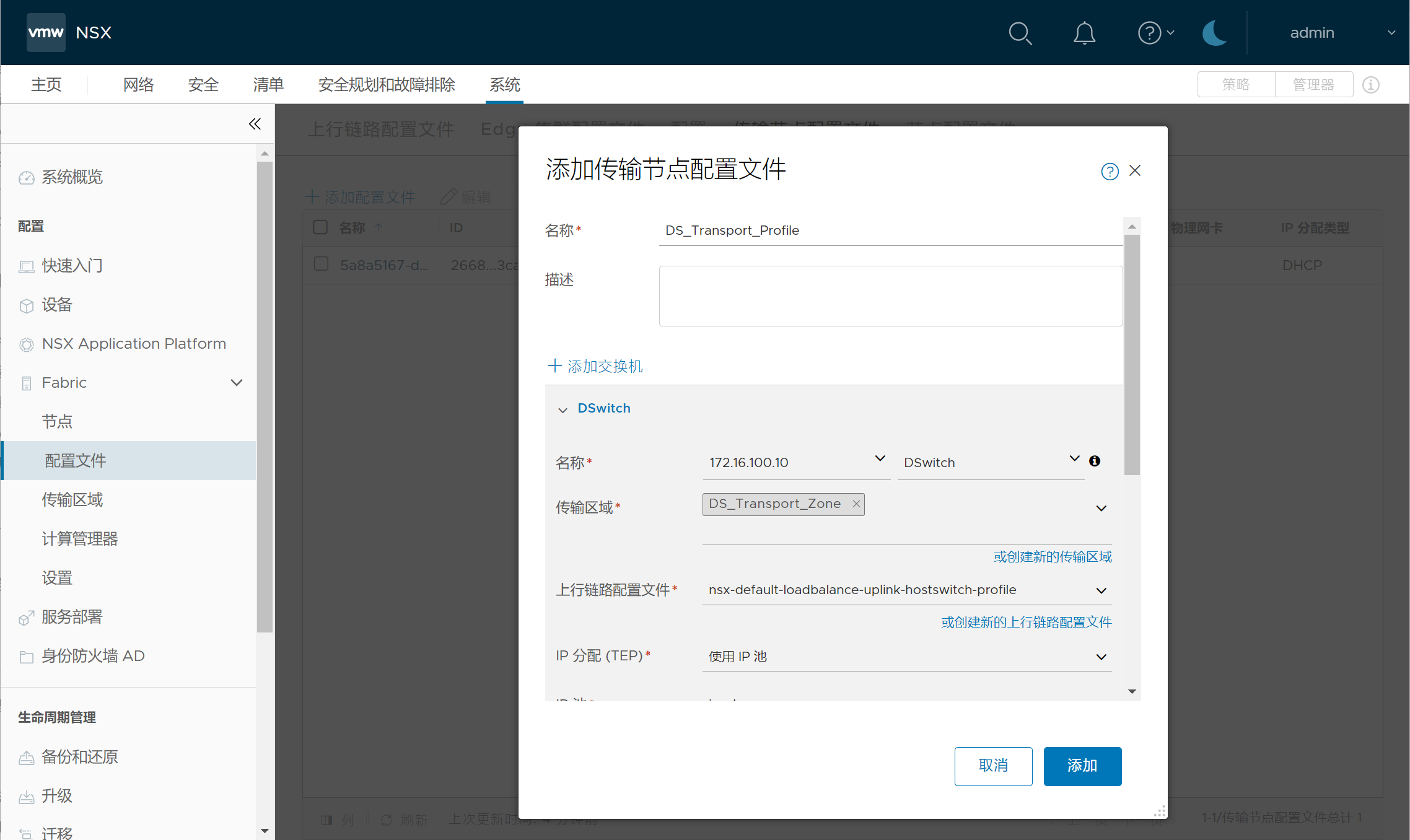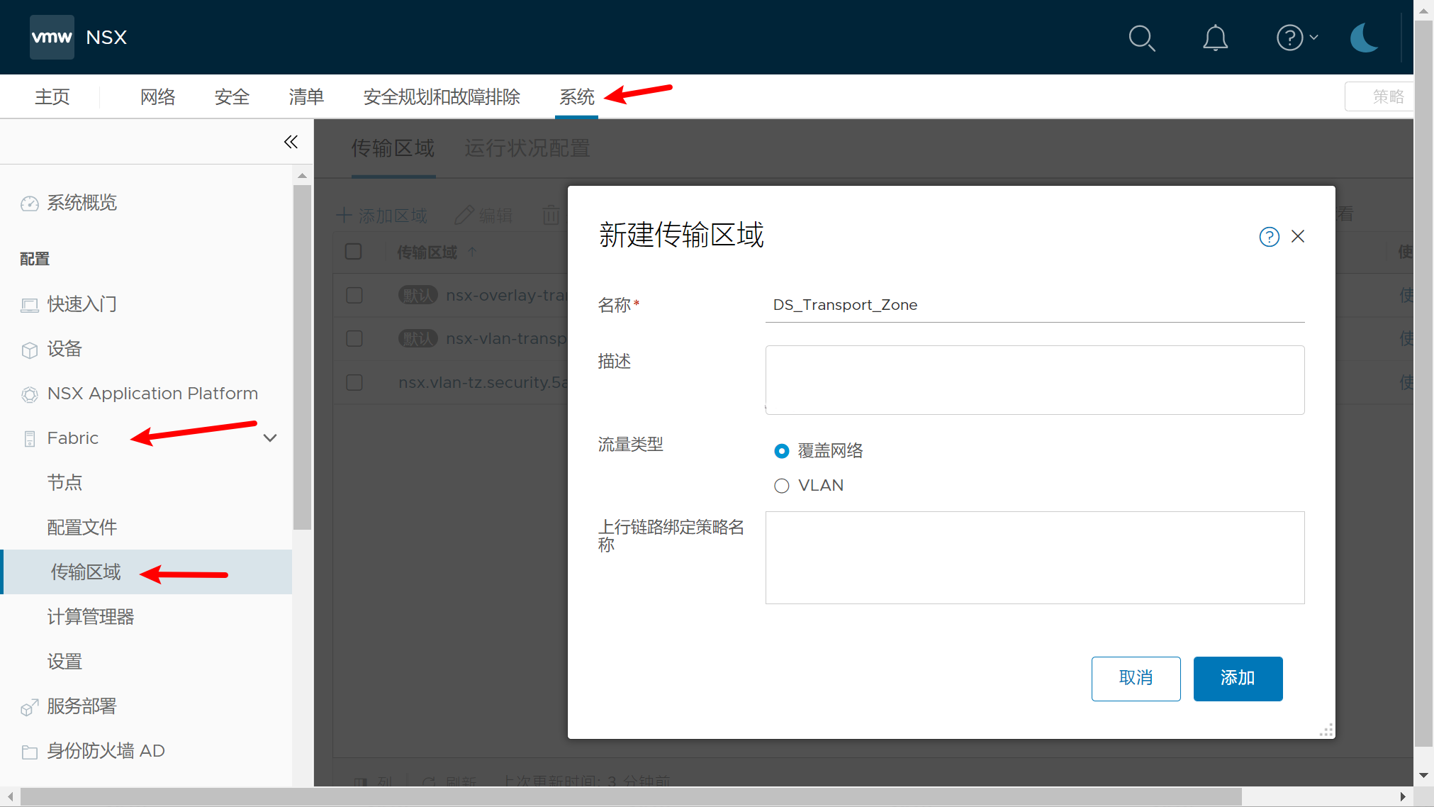 登录NSX,系统-Fabric-传输区域,创建一条DS_Transport_Zone;