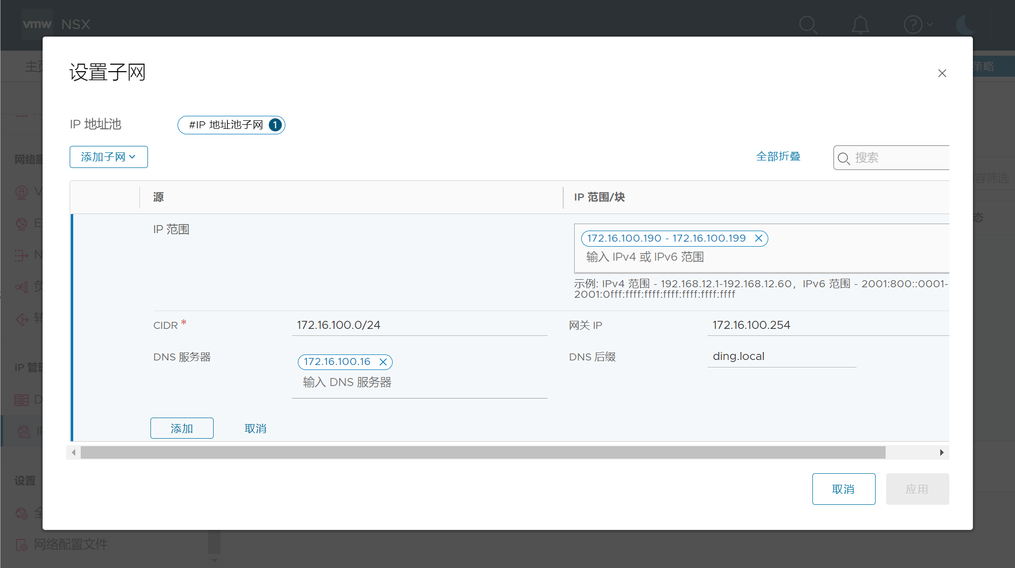 设置IP子网,填写DNS和DNS后缀。