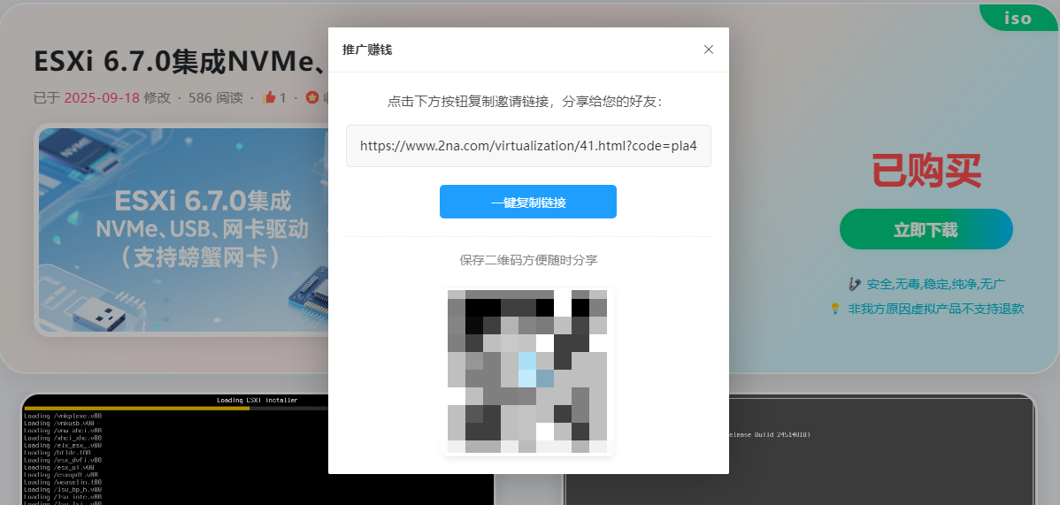 到这一步你的推广链接已经复制成功了,如下“http://www.2na.com/virtualization/41.html?code=pla4”,此链接前面是资源的原始链接,后面是你的推广ID,pla4就是你的个人专属推广ID(注意·pla4这个专属推广ID是编写本教程作者的专属推广ID,不同的用户的专属推广ID是不同的,每个人都有自己的专属推广ID,只有在相关页面点击分享才能正确获取相关专属推广ID哦,不要搞错了),此链接是可以正常打开的。用户只有在此链接(带有你个人专属推广ID的链接)下的页面付费下载资源,你才能正确的享受推广提成。