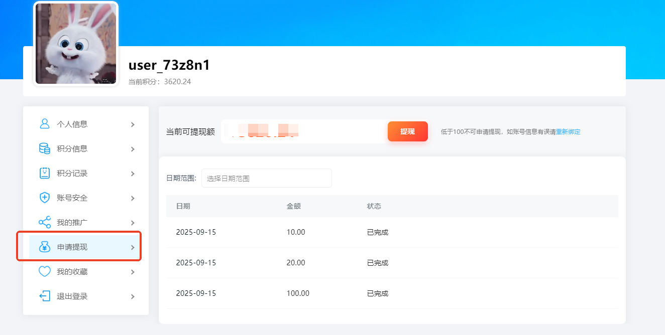 如果你推广了很多资源出去了,提成金额达到100元以上你就可以在本站提现,提现也非常简单。