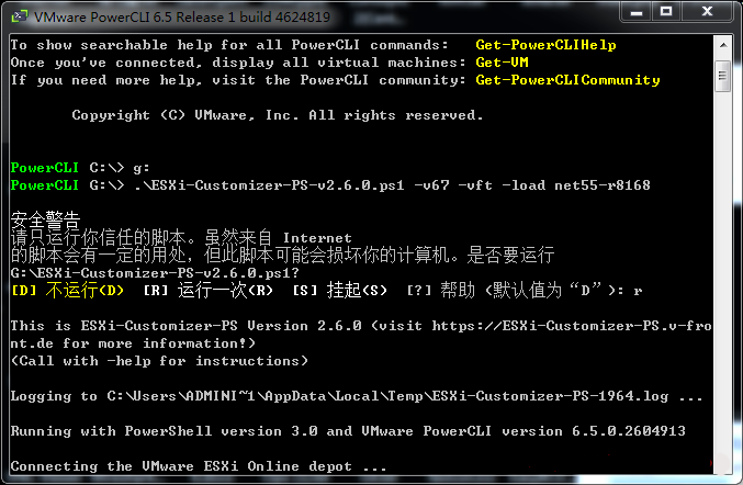 5、我这里ESXi-Customizer-PS-v2.6.0.ps1放在了G盘,这里需要切换下盘符,然后执行