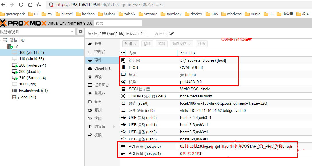 nano /etc/pve/qemu-server/100.conf #qemu10替换成下面这一行,这里和以前PVE8有点区别 args: -set device.hostpci0.bus=pcie.0 -set device.hostpci1.bus=pcie.0 -set device.hostpci0.addr=0x02.0 -set device.hostpci1.addr=0x03.0 -set device.hostpci0.x-igd-gms=0x2 -set device.hostpci0.x-igd-opregion=on -set device.hostpci0.x-igd-lpc=on # EFI引导 bios: ovmf #CPU类型 cpu: host #机型选择Q35 machine: pc-q35-9.0 #加载直通显卡ROM和HDMI直通声卡 hostpci0: 0000:00:02.0,romfile=AOOSTAR_N1_PRO_N150.rom hostpci1: 0000:00:1f.3 #关闭虚拟显卡,用直通显示 vga: none