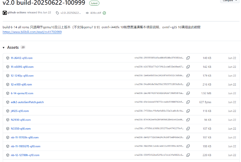 2、要下载支持PVE9 qemu10的ROM,这里6-14代 all roms 只适用于qemu10及以上版本(不支持qemu7 8 9),(修改版QUME和核显直通ROM均来自于B站:李晓流 Github:lixiaoliu666)