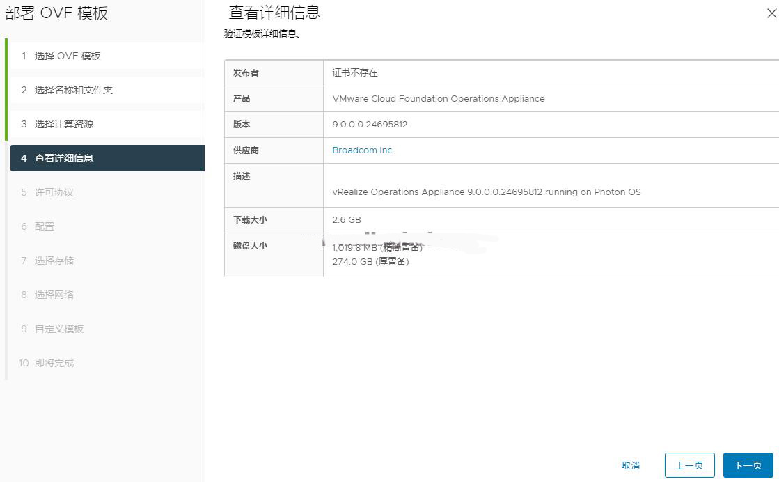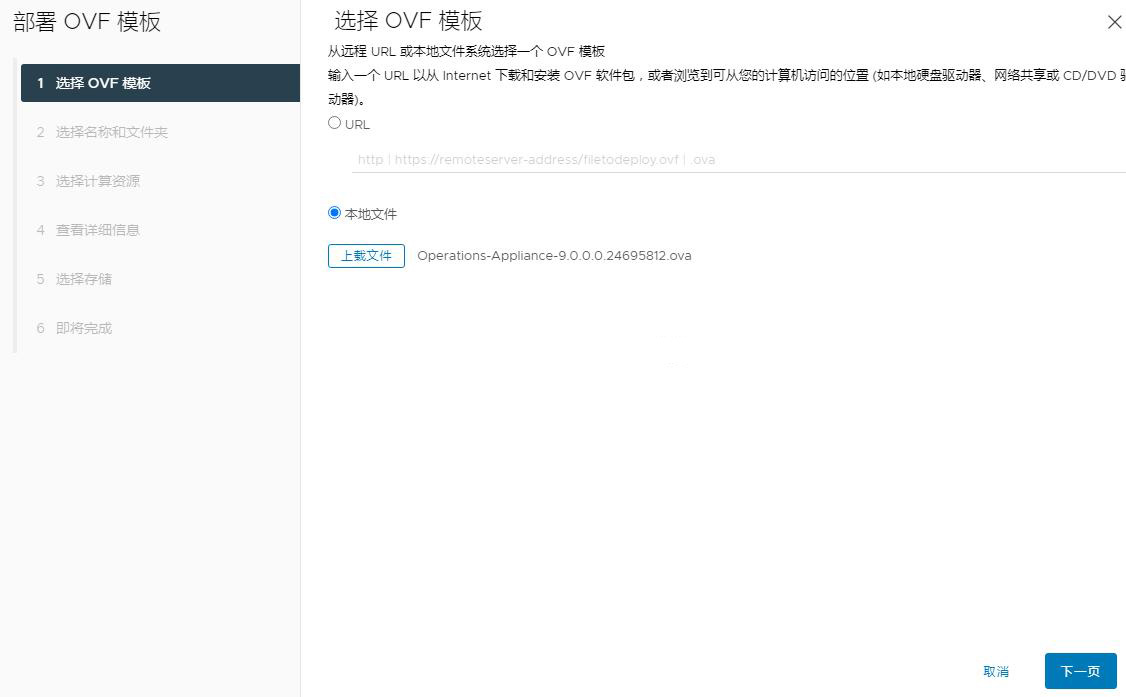 从博通官网下载文件:Operations-Appliance-9.0.0.0.24695812.ova, 登录vCenter,选择主机,右键导入OVF,本地文件,上载文件;