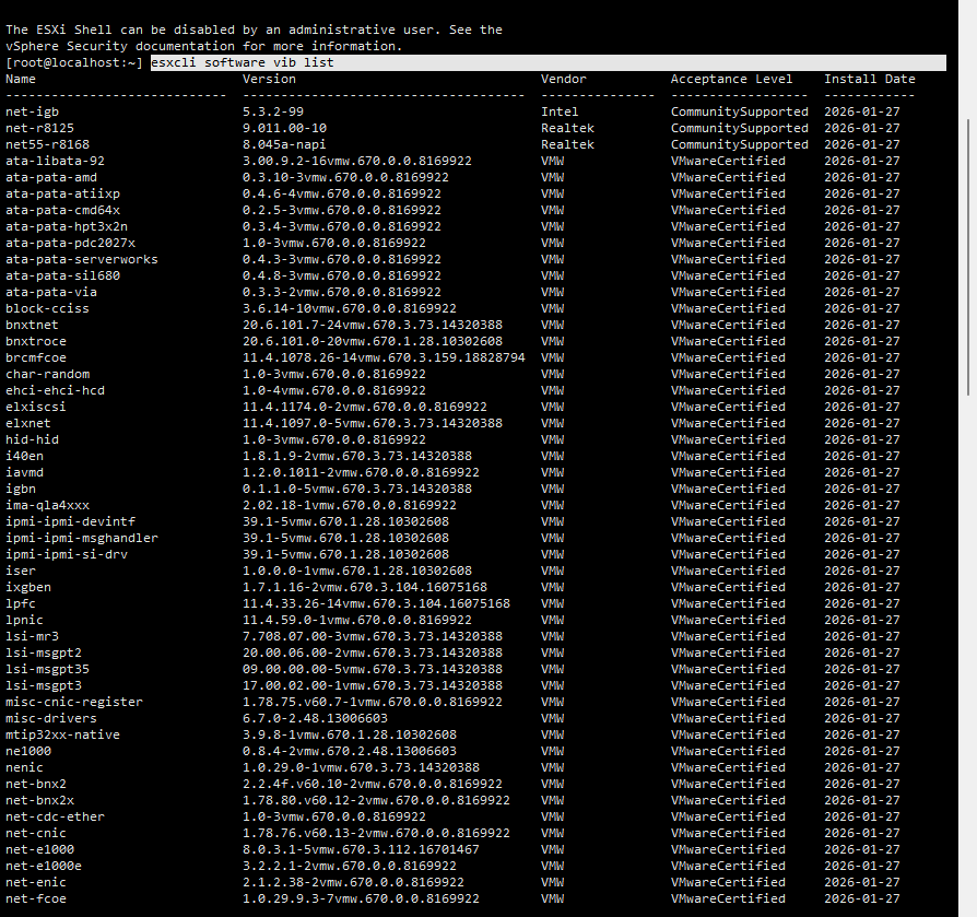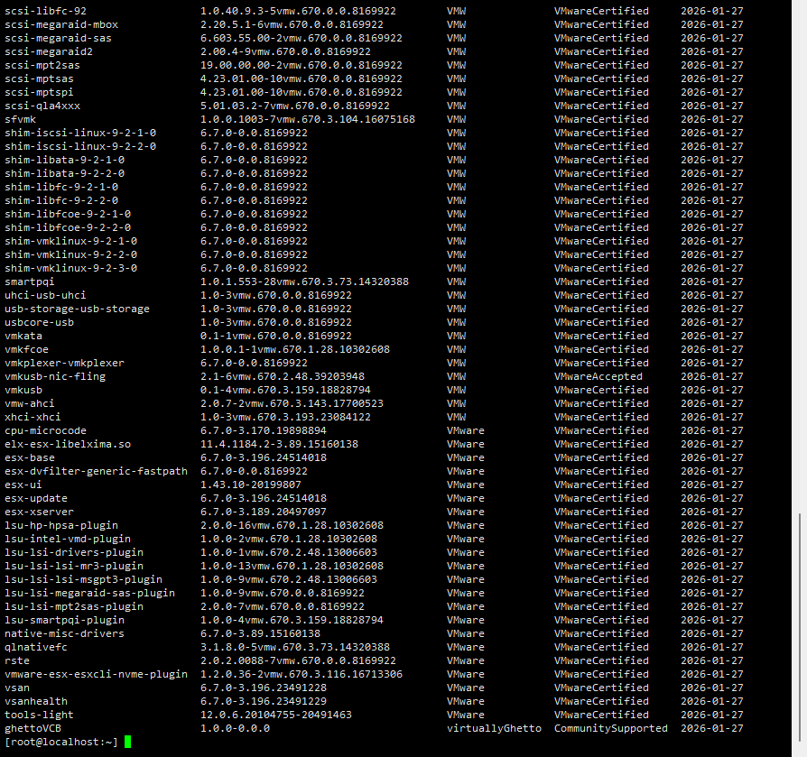 (部署完成后,用esxcli software vib list命令可以查询到已成功集成的驱动)